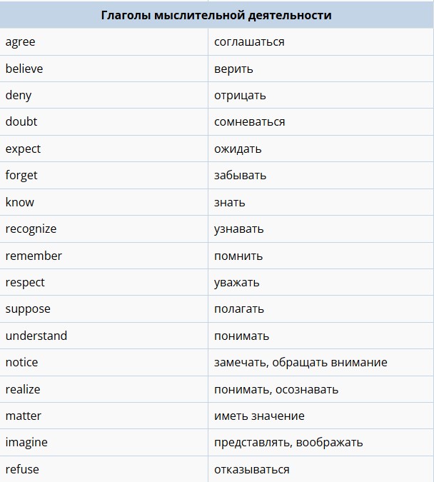 | Think | Думать в зн. «полагать, считать» I think he is a kind man. – Я думаю, он добрый человек. | Думать в зн. «размышлять», “подумывать” I’m thinking of taking driving lessons. – Я размышляю над тем, чтобы записаться на уроки вождения |